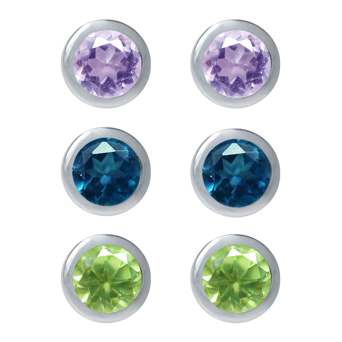 3 Pair Petite 3mm Genuine Amethyst Peridot and London Blue Topaz 925 Sterling Silver Stud Earrings Set