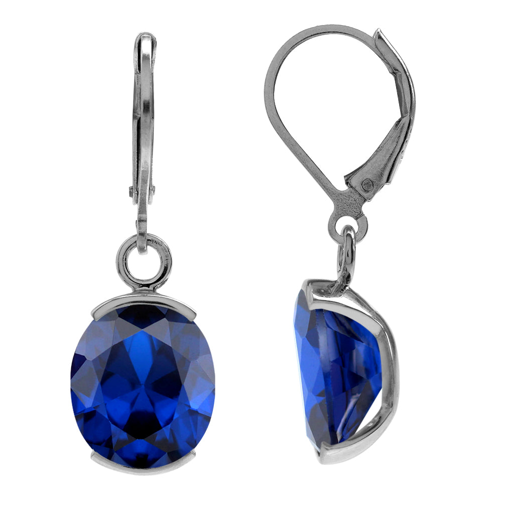 12X10mm Created Oval Shape Blue Sapphire White Gold Plated 925 Sterling Silver Leverback Dangle Earrings September Gemstone Birthstone