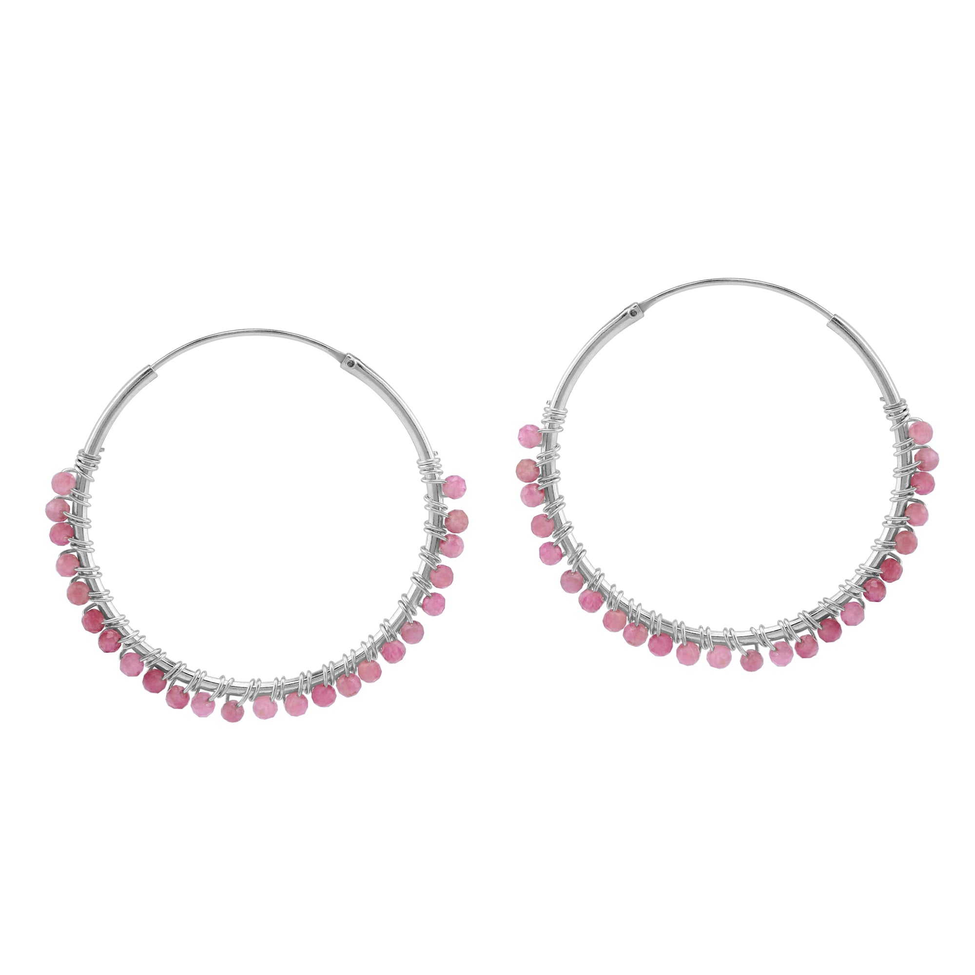 30MMx2MM Natural Pink Tourmaline Gemstone Bead 925 Sterling Silver Boho 1.18 Inch Handmade O-Hoop Earrings Jewelry for Women October Birthstone