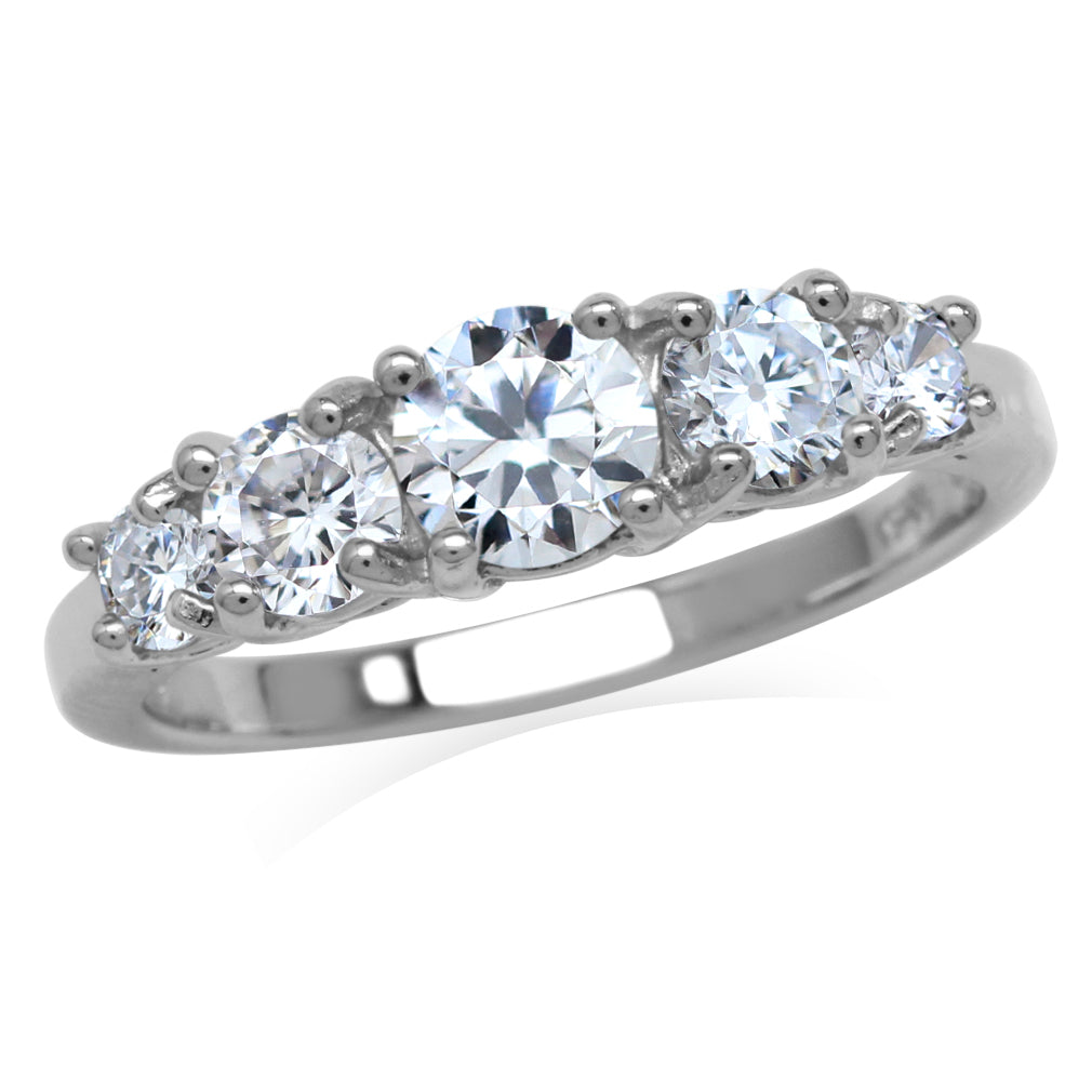 5-Stone Round Shape White Cubic Zirconia White Gold Plated 925 Sterling Silver Ring April Gemstone Birthstone